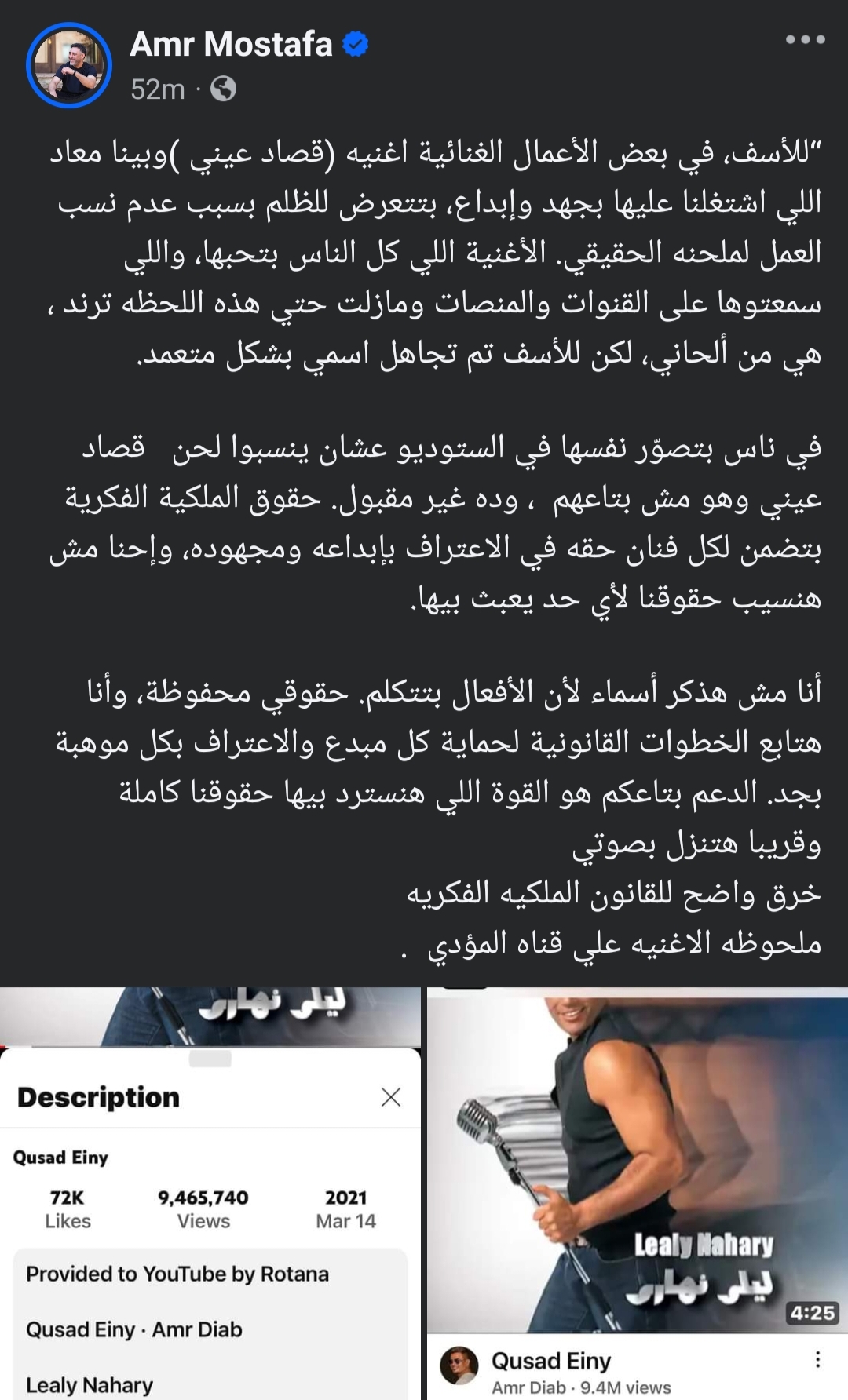 شارك الملحن عمرو مصطفى منشور عبر حسابه الرسمي على موقع التواصل الاجتماعي فيسبوك وأعلن من خلاله أن صناع أغنية قصاد عيني وبينا ميعاد لـ الهضبة عمرو دياب تعمدوا تجاهل وضع اسمه على أنه الملحن الأصلي للأغاني، وقال عمرو مصطفى في منشور عبر حسابه على فيسبوك يرصده موقع تحيا مصر: “للأسف، في بعض الأعمال الغنائية اغنيه قصاد عيني وبينا معاد اللي اشتغلنا عليها بجهد وإبداع، بتتعرض للظلم بسبب عدم نسب العمل لملحنه الحقيقي.. الأغنية اللي كل الناس بتحبها واللي سمعتوها على القنوات والمنصات ومازالت حتى هذه اللحظه ترند، هي من ألحاني لكن للأسف تم تجاهل اسمي بشكل متعمد".