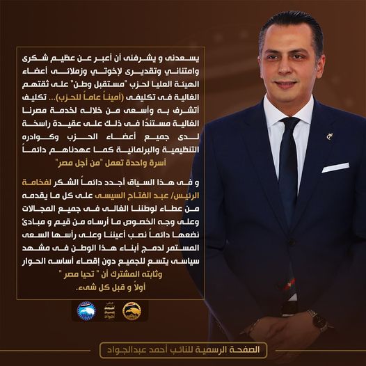 أعرب النائب أحمد عبد الجواد عن امتنانه وتقديره لاختياره من الهيئة العليا لحزب مستقبل وطن، أمينا عاما للحزب.