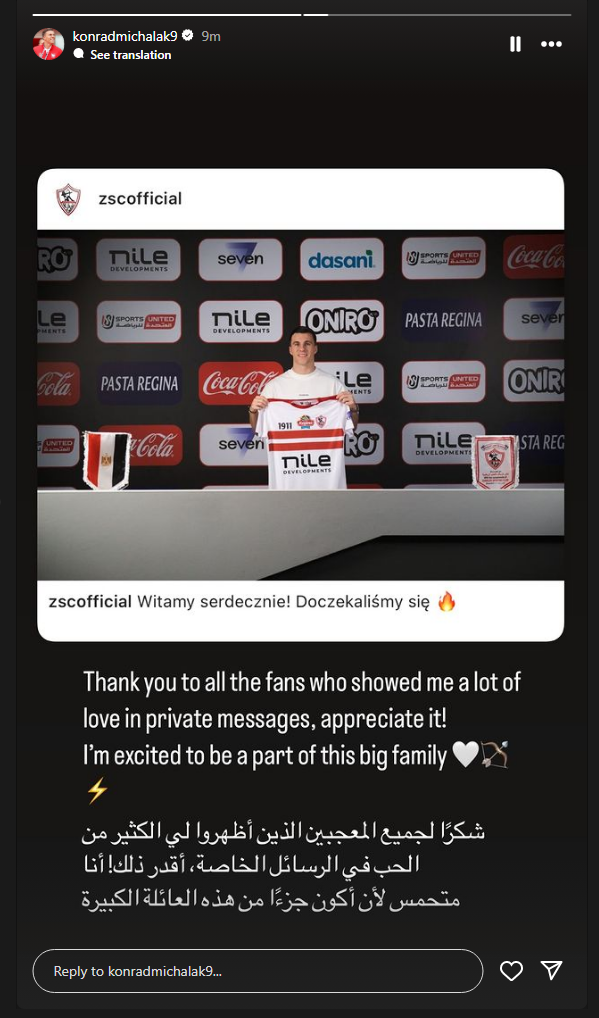 تحيا مصر، وكتب البولندي كونراد ميشالاك لاعب الزمالك الجديد عبر حسابه الرسمي" إنستجرام":" شكراً لجميع المعجبين الذين أظهروا لي الكثير من الحب والرسائل الخاصة أقدر ذلك أنا متحمس لأن أكون جزءاً من هذه العائلة الكبيرة".