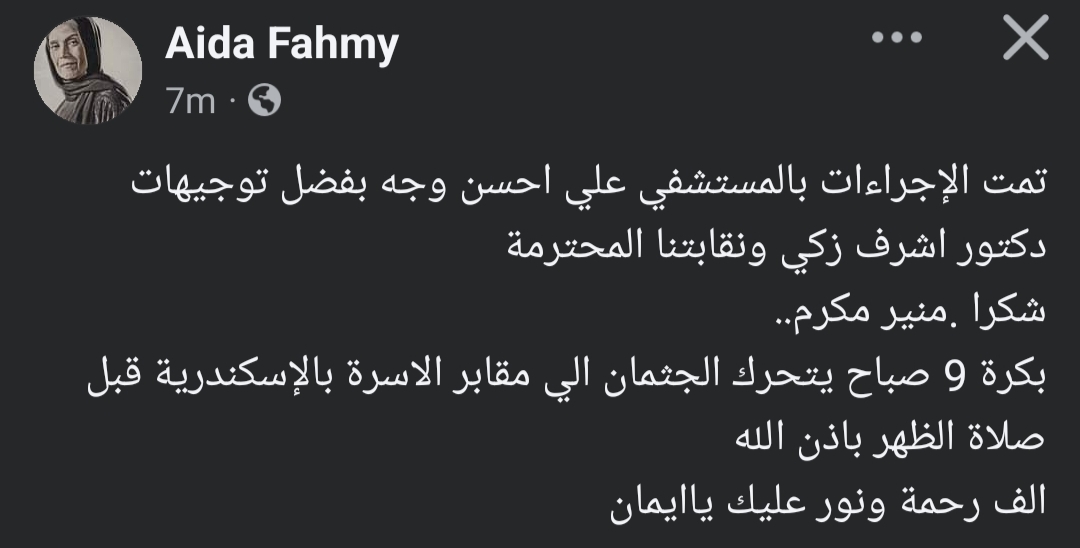 شكرا الفنان منير مكرم، وبكرة 9 صباح يتحرك الجثمان الي مقابر الاسرة بالإسكندرية قبل صلاة الظهر بإذن الله.. الف رحمة ونور عليك يا إيمان".