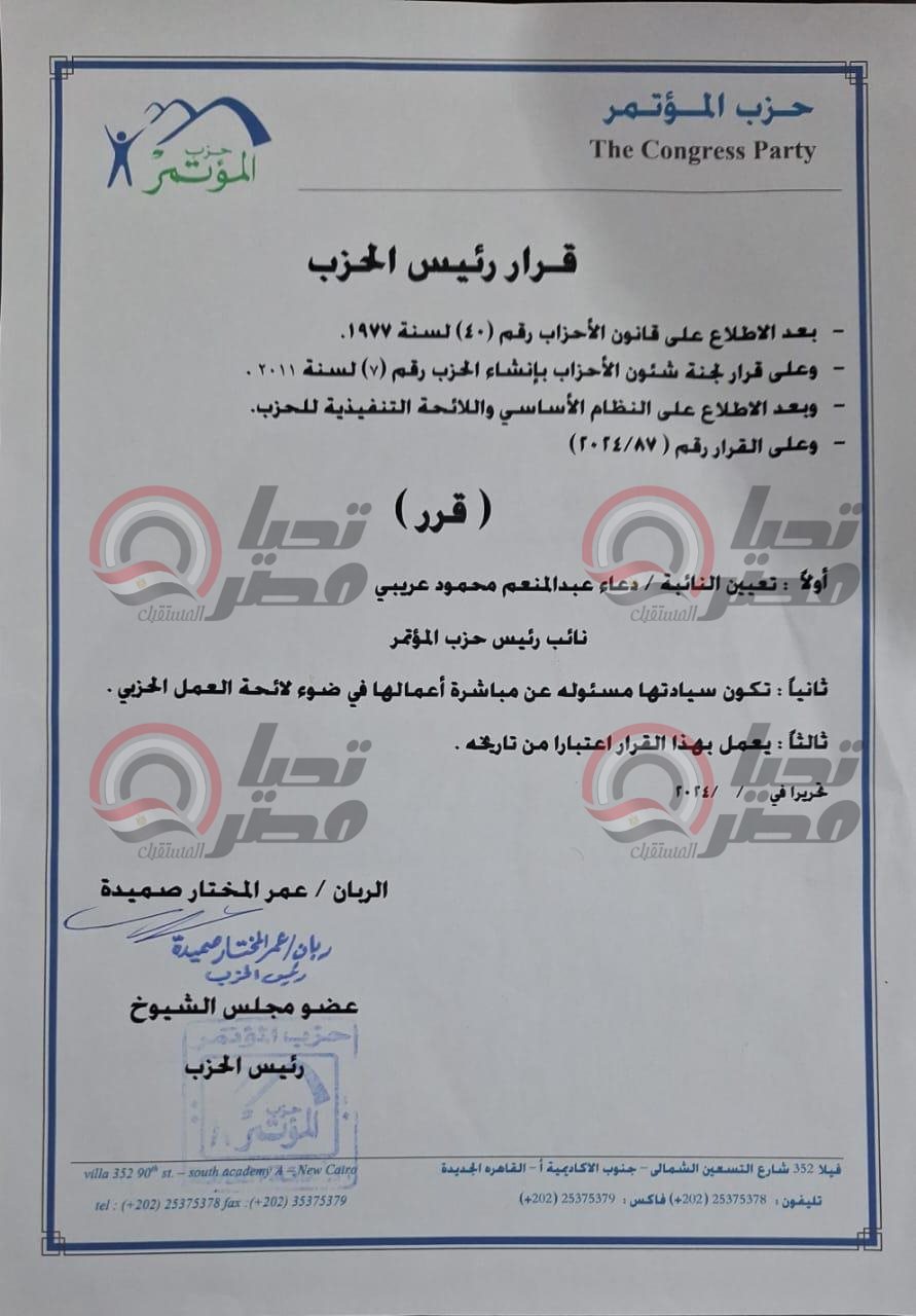 وحصل موقع تحيا مصر على صورة من قرار تعيين النائب دعاء عريبي نائبًا لرئيس الحزب، وجاء نصه كالتالي: