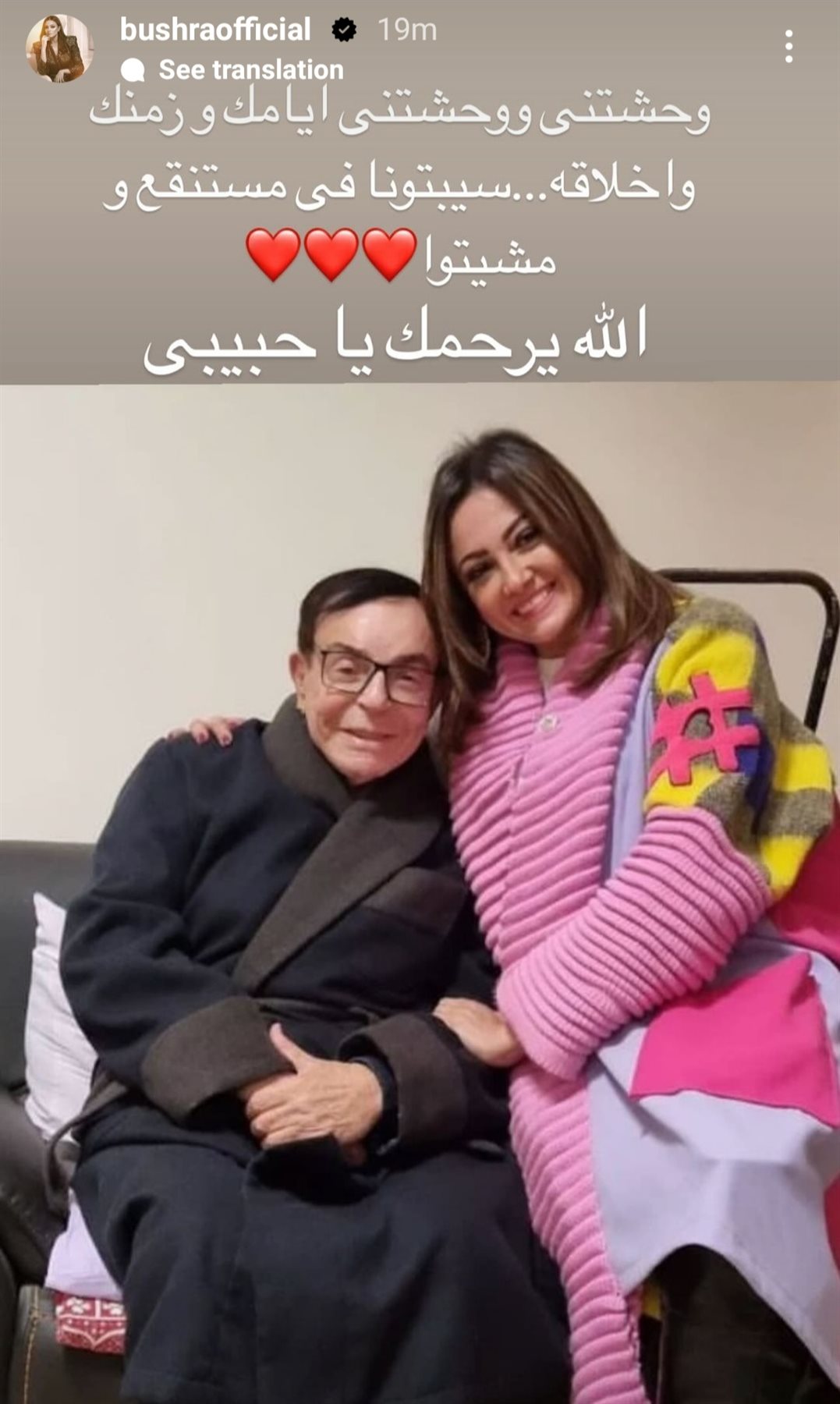 ونشرت بشرى صورة لها رفقة الفنان الراحل سمير صبري، رصدها موقع تحيا مصر، من خلال خاصية استوري، وعلقت عليها قائلة: "وحشتني ووحشتني أيامك وزمانك وأخلاقك، سيبتونا في مستنقع ومشيتوا، الله يرحمك يا حبيبي".