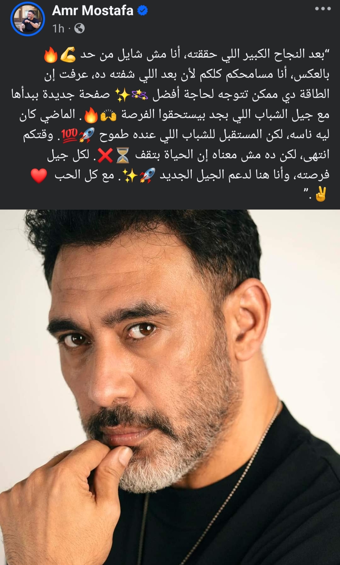 شارك الملحن عمرو مصطفى منشور عبر حسابه الرسمي على موقع التواصل الاجتماعي فيسبوك يتحدث فيه عن منافسيه ويوجه لهم رسالة مؤكدًا من خلالها أنه لم يهتم الآن لتلك المنافسات وأنه كل ما يشغل ذهنه هو الاهتمام بالشباب والأجيال الحالية من الموهوبين، وقال عمرو مصطفى في منشور يرصده موقع تحيا مصر: "بعد النجاح الكبير اللي حققته، أنا مش شايل من حد بالعكس، أنا مسامحكم كلكم لأن بعد اللي شفته ده، عرفت إن الطاقة دي ممكن تتوجه لحاجة أفضل صفحة جديدة ببدأها مع جيل الشباب اللي بجد بيستحقوا الفرصة الماضي كان ليه ناسه، لكن المستقبل للشباب اللي عنده طموح وقتكم انتهى، لكن ده مش معناه إن الحياة بتقف لكل جيل فرصته، وأنا هنا لدعم الجيل الجديد مع كل الحب”.