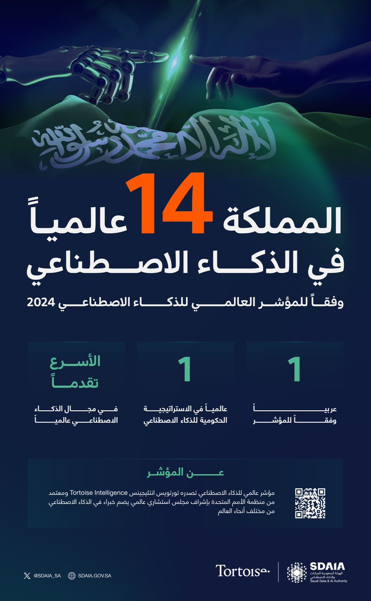 حققت المملكة العربية السعودية إنجازًا عالميًا جديدًا بحصولها على المركز الأول عربياً والـ 14 عالميًا في المؤشر العالمي للذكاء الاصطناعي لعام 2023. ويأتي هذا التقدم بعد تصدر المملكة لقائمة الدول الأسرع تقدمًا في هذا المجال، إذ قفزت 17 مرتبة خلال السنوات الأخيرة، ما يرسخ موقعها كواحدة من الدول الرائدة عالميًا في تطوير واستخدام الذكاء الاصطناعي.