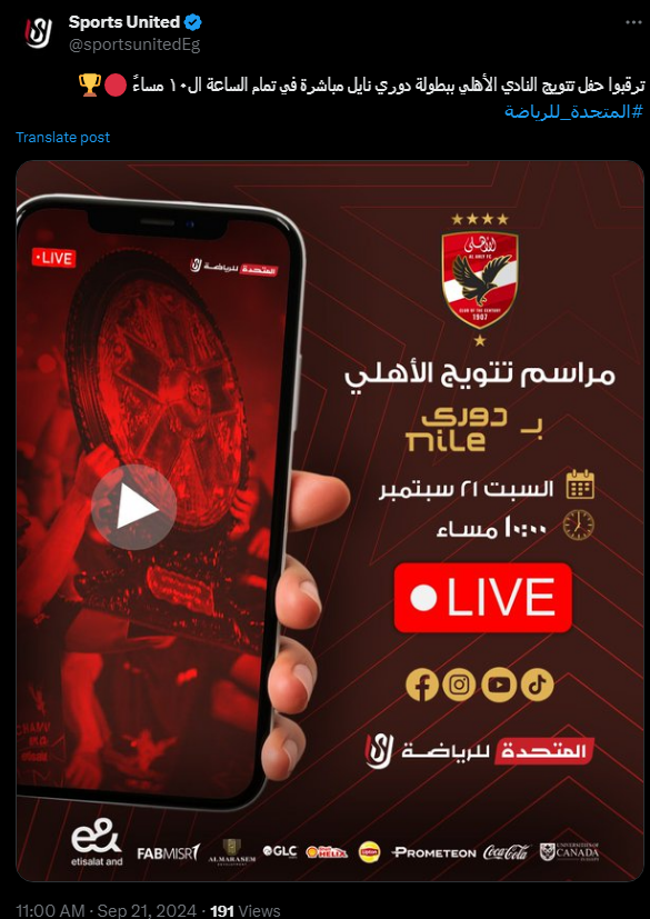 أعلن الحساب الرسمي للشركة المتحدة للرياضة ، عبر حسابه الرسمي" أكس، على موقع إكس، عن بث الحساب لـ احتفال النادي الاهلي بدرع دوري نايل .