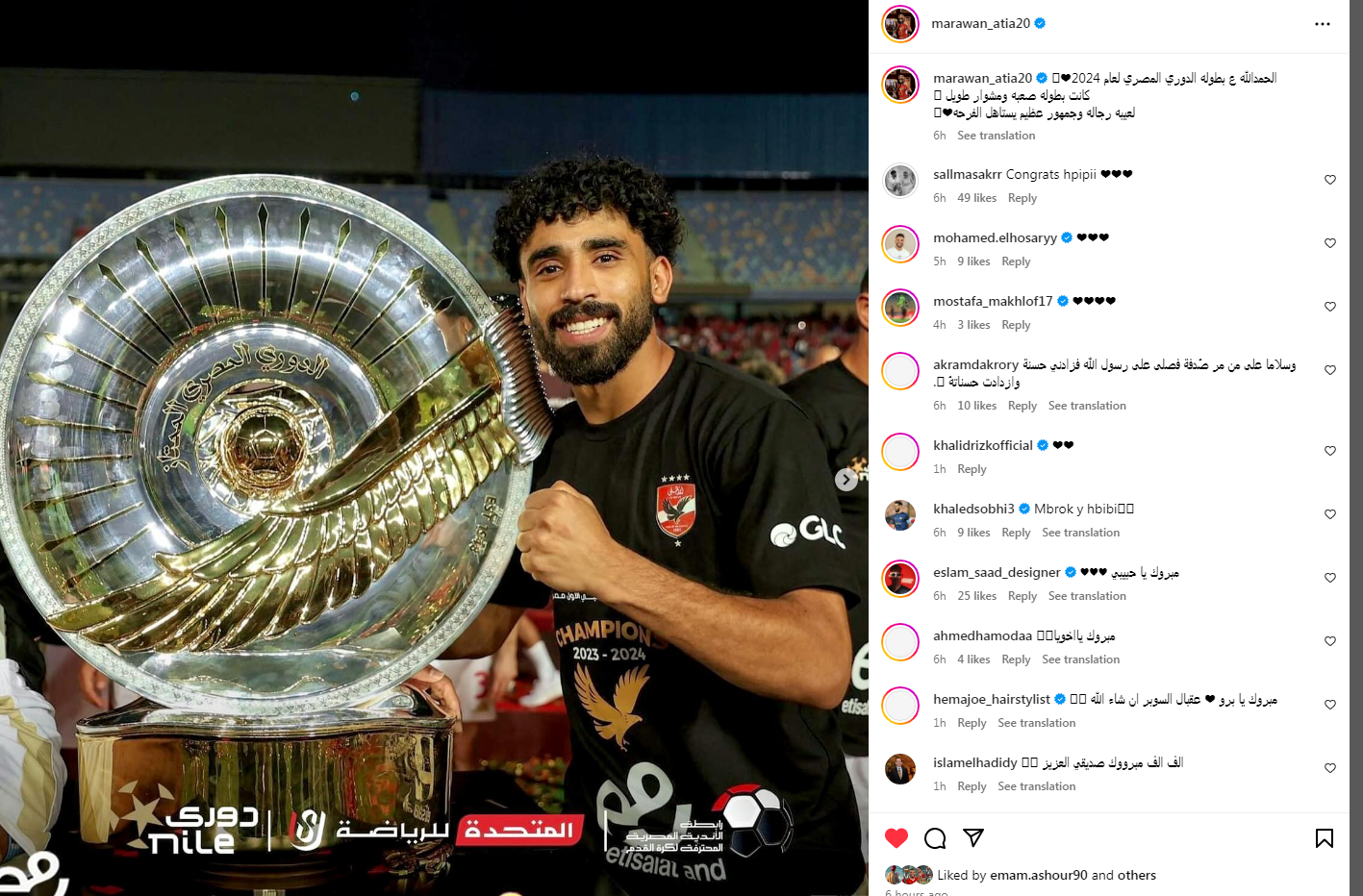 تحيا مصر، وكتب مروان عطية عبر إنستجرام:"الحمدالله على بطوله الدوري المصري لعام 2024 كانت بطولة صعبه ومشوار طويل لعيبه رجالة وجمهور عظيم يستاهل الفرحة".
