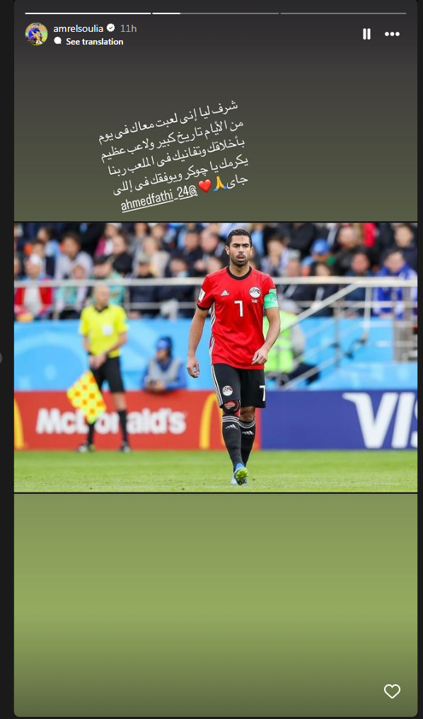 تحيا مصر، وكتب عمرو السولية لاعب الأهلي عبر حسابه الرسمي"إنستجرام":" شرف ليا إني لعبت معاك في يوم من الأيام تاريخ كبير ولاعب عظيم يأخلاقك وتفانيك في الملعب ربنا يكرمك يا جوكر ويوفقك في اللي جاي".