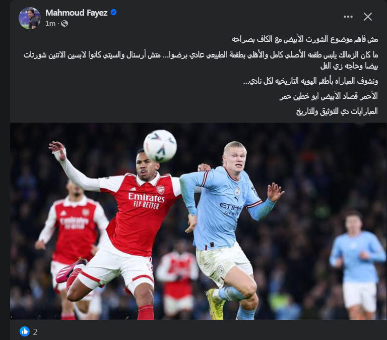 تحيا مصر، وكتب محمود فايز عبر حسابه الرسمي"فيسبوك":" مش فاهم موضوع الشورت الأبيض مع الكاف بصراحة، ما كان الزمالك يلبس طقمة الأصلي كامل والأهلي بطقمة الطبيعي عادي برضوا".