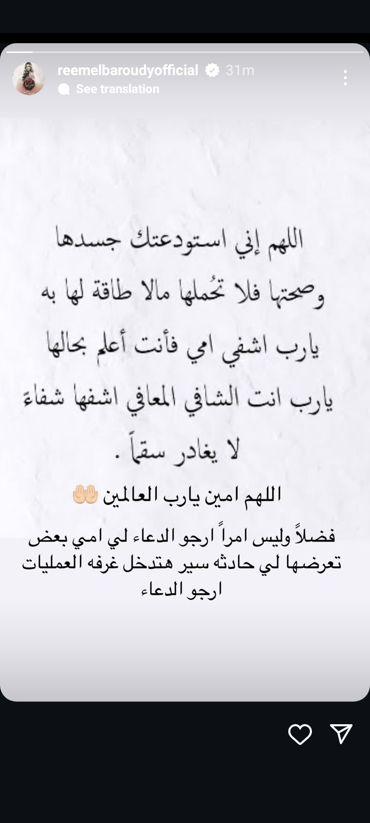 وتابعت ريم البارودي حديثها، قائلة: فضلًا وليس أمرًا أرجو الدعاء لوالدتي بعد تعرضها لحادث سير وهتدخل غرفة العمليات.. أرجو الدعاء.