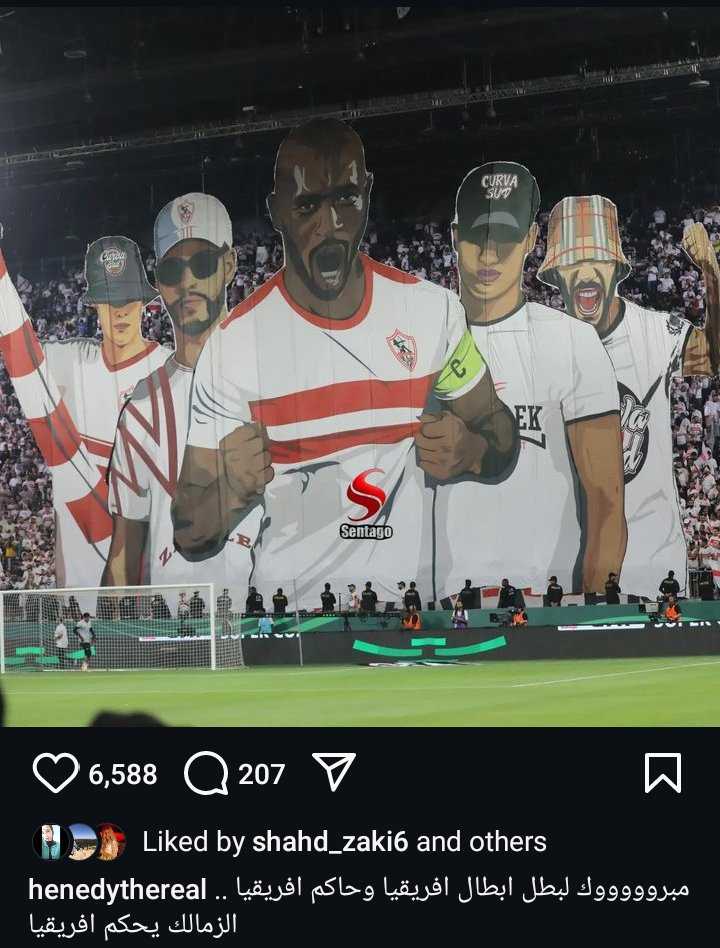 ونشر محمد هنيدي صورة لفريق نادي الزمالك عبر حسابه الرسمي بموقع تبادل الصور والفيديوهات انستجرام وعلق عليها قائلا: مبروك لبطل أبطال إفريقيا وحاكم افريقيا.. الزمالك يحكم إفريقيا.