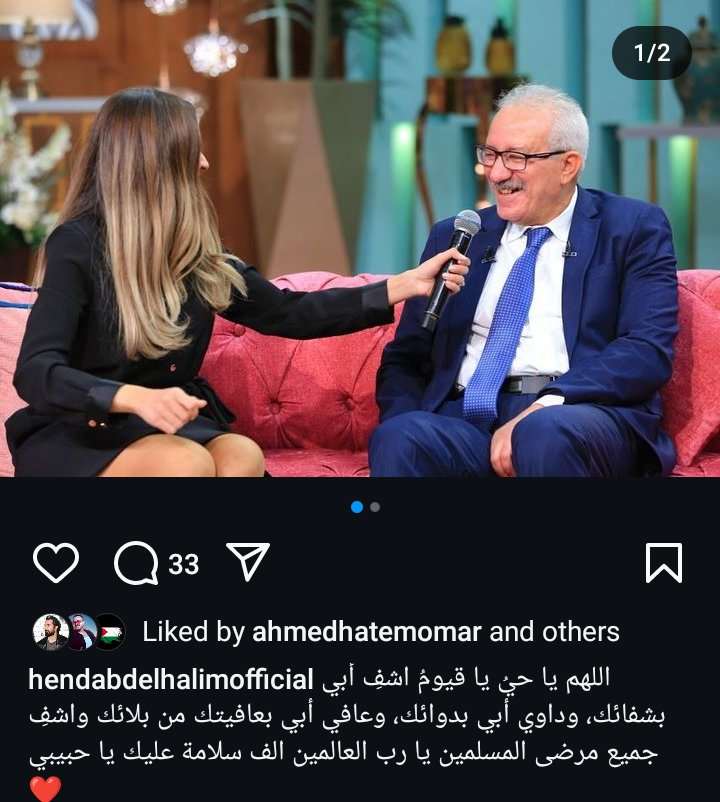 وقالت هند عبد الحليم في منشور عبر حسابها الرسمي بموقع انستجرام ورصده موقع تحيا مصر: اللهم يا حيُ يا قيومُ اشفِ أبي بشفائك، وداوي أبي بدوائك، وعافي أبي بعافيتك من بلائك واشفِ جميع مرضى المسلمين يا رب العالمين الف سلامة عليك يا حبيبي.