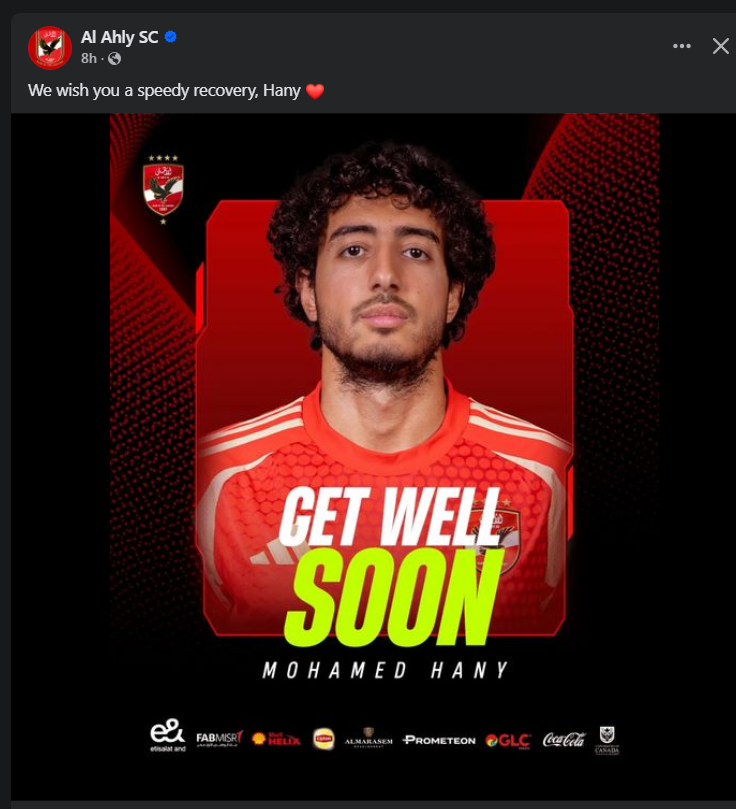 تحيا مصر، وحرصت الصفحة الرسمية للنادي الأهلي عبر "فيسبوك":،على تمني الشفاء لللاعب وكتب:" نتمنى لك الشفاء العاجل يا هاني".