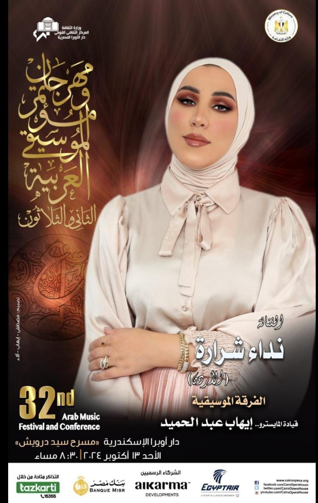 تعود المطربة الاردنية نداء شرارة للمشاركة في الدورة ال ٣٢ من مهرجان الموسيقي العربية وذلك بعد غياب دام لأكثر من 3 سنوات حيث من المقرر أن تحيي حفلين يوم ١٣ و ١٦ اكتوبر بقيادة المايسترو إيهاب عبد الحميد.