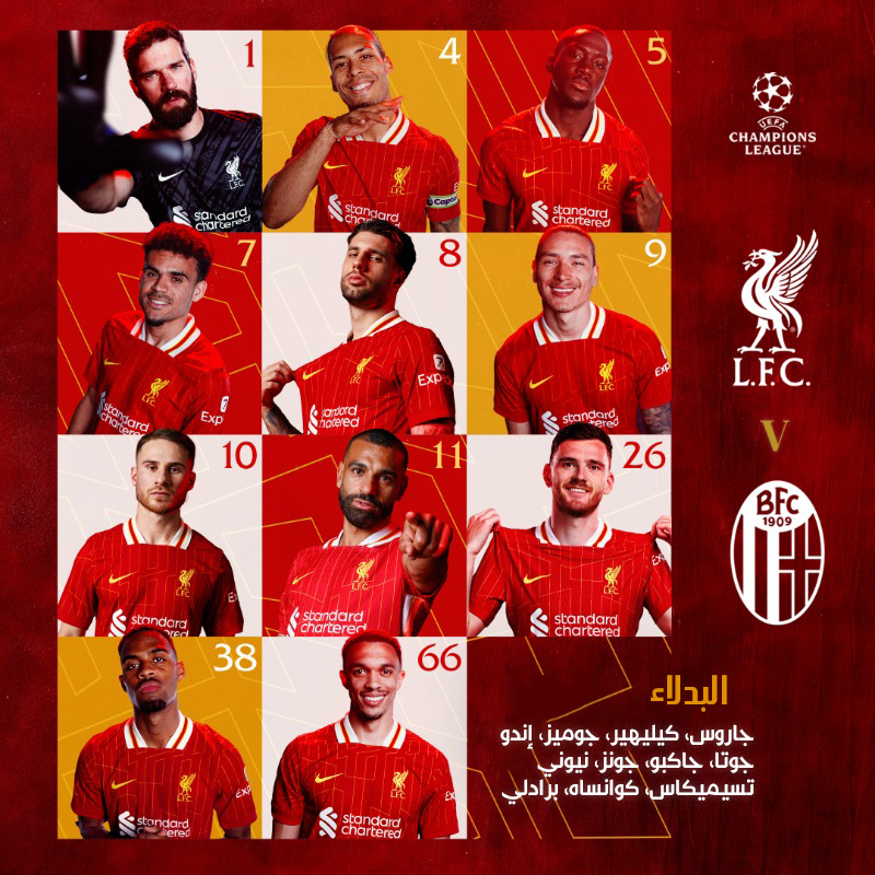 ويأتي تشكيل ليفربول لمواجهة بولونيا كالتالي:-