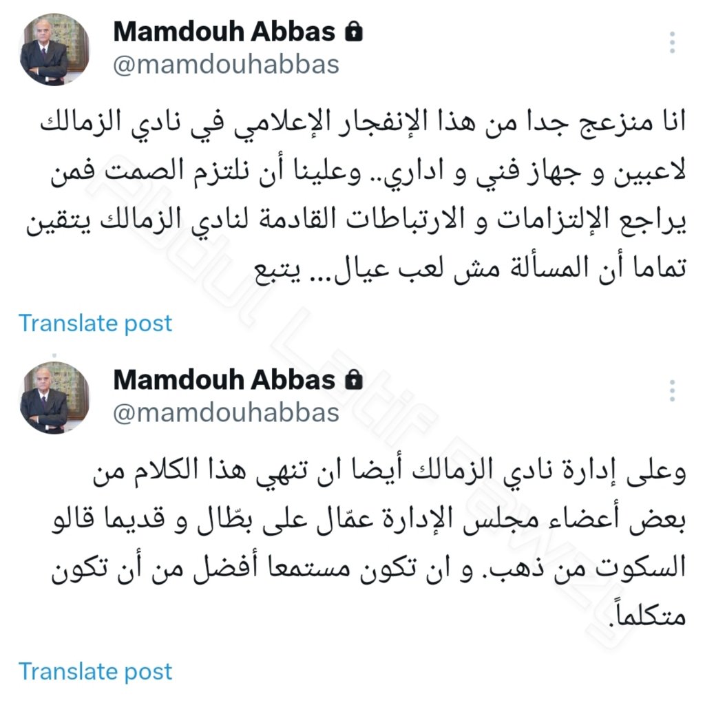 وكتب ممدوح عباس عبر حسابه الرسمي على منصة x: «انا منزعج جدا من هذا الإنفجار الإعلامي في نادي الزمالك لاعبين و جهاز فني و اداري وعلينا أن نلتزم الصمت فمن يراجع الإلتزامات و الارتباطات القادمة لنادي الزمالك يتقين تماما أن المسألة مش لعب عيال».