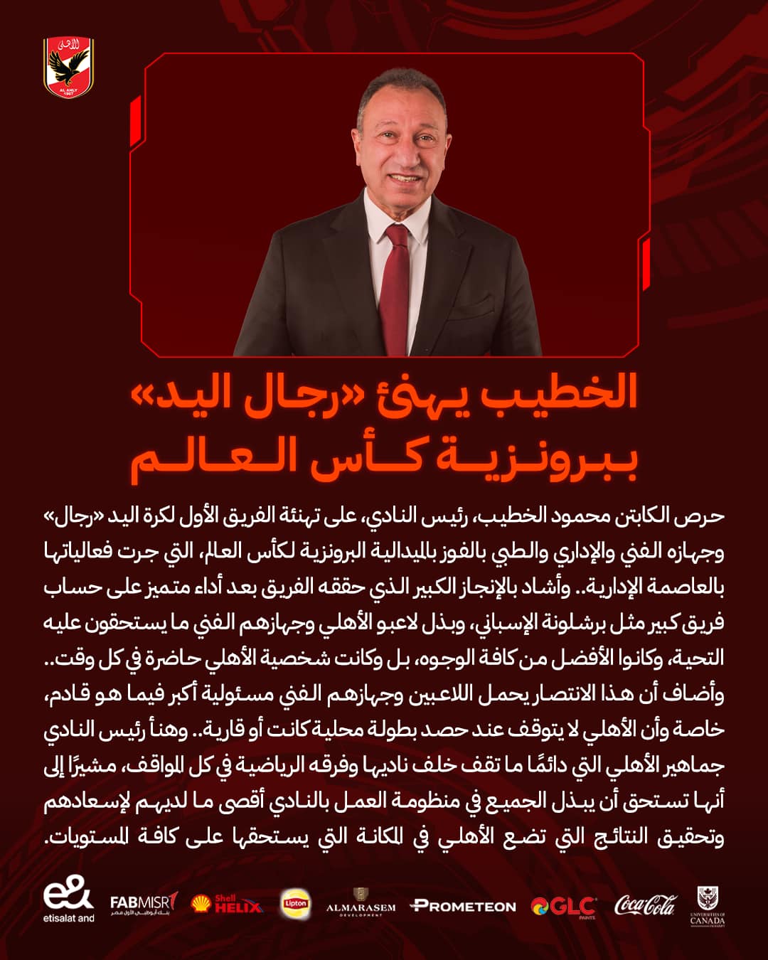 الخطيب يهنئ «رجال يد الأهلي» ببرونزية كأس العالم