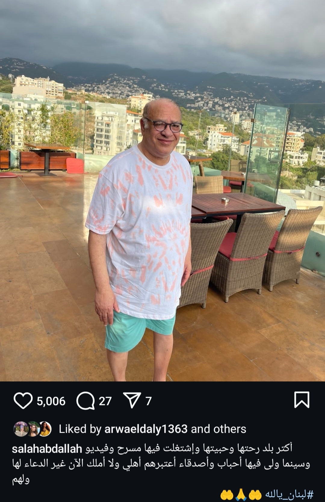 أعرب الفنان الكبير صلاح عبد الله عن جبه لـ لبنان بلد الجمال وأكد على تضامنه الكامل معها ودعمها بكلمات توضح مدى تعلقه بها، حيث أشار صلاح عبد الله إلى أعماله في لبنان والنجاحات التي حققها على المسرح اللبناني، كما أشار إلى أصدقاؤه الذين يعيشون هناك وأكد على معزتهم في قلبه، وأرفق صلاح عبد الله صورة له في لبنان من الذكريات عبر حسابه الرسمي على موقع تبادل الصور والفيديوهات انستجرام يرصدها موقع تحيا مصر وعلق عليها: “أكثر بلد رحتها وحبيتها واشتغلت فيها مسرح وفيديو وسينما ولى فيها أحباب وأصدقاء أعتبرهم أهلي ولا أملك الآن غير الدعاء لها ولهم”.