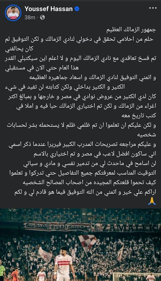 وأضاف يوسف حسن: «تم فسخ تعاقدي مع نادي الزمالك اليوم و لا اعلم اين سيكتبلي القدر هذا العام حتي الان في مستقبلي، واتمني التوفيق لنادي الزمالك و إسعاد جماهيره العظيمة».