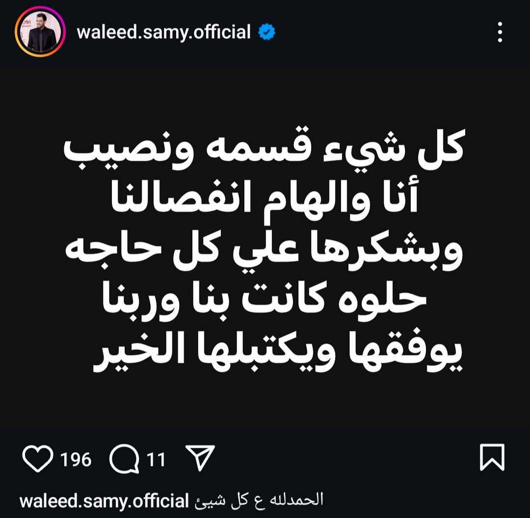 أعلن الملحن وليد سامي انفصاله عن الفنانة إلهام عبد البديع وذلك في منشور عبر حسابه الرسمي بموقع تبادل الصور والفيديوهات انستجرام، موجها رسالة شكر لها على الايام الذي تواجدوا فيها معا.