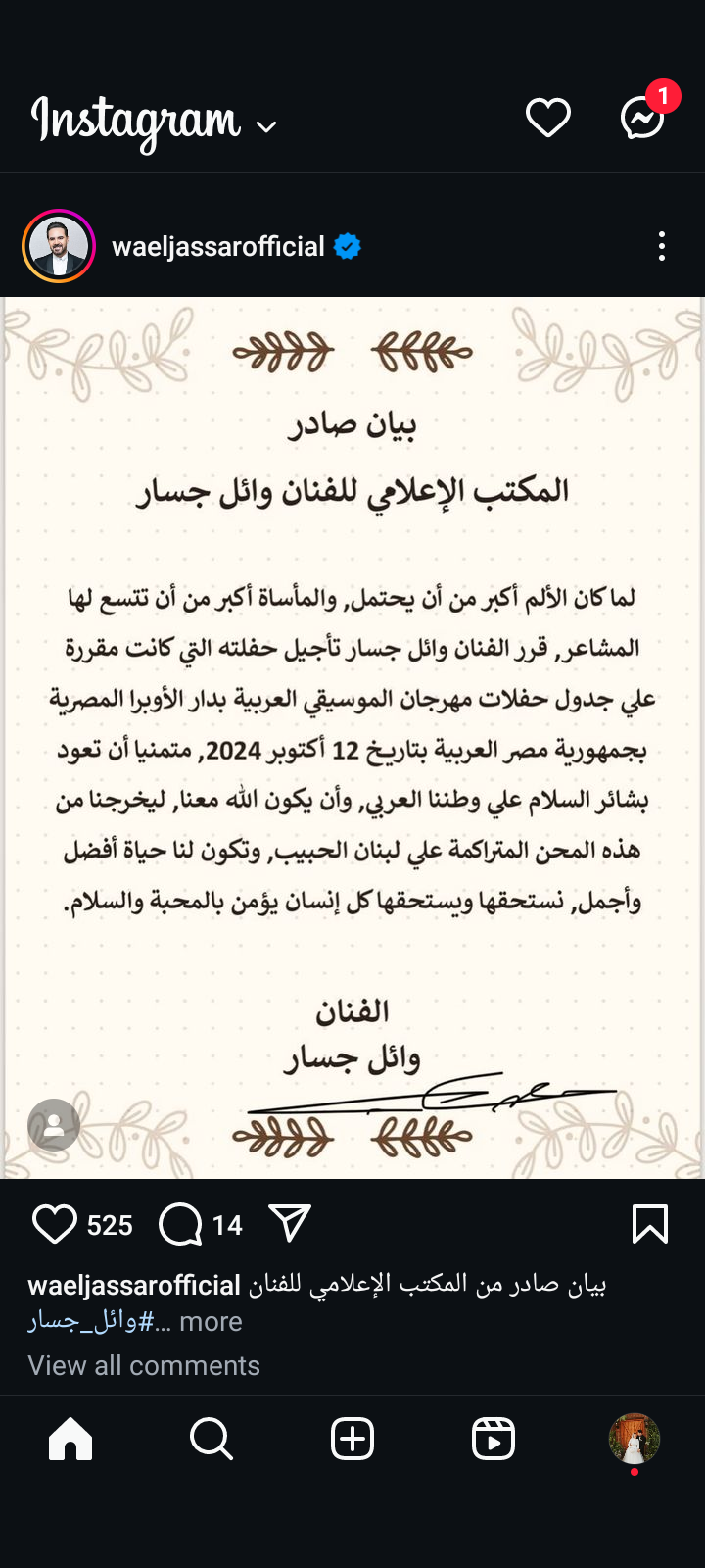 وأصدر وائل جسار بيان عبر حسابه الرسمي بموقع تبادل الصور والفيديوهات انستجرام ورصده موقع تحيا مصر، جاء فيه: لما كان الألم أكبر مما يحتمل والمأساة أكبر من أن تتسع لها المشاعر، قرر الفنان وائل جسار تأجيل حفلته التي كانت مقررة على جدول حفلات مهرجان الموسيقى العربية بتاريخ 12 أكتوبر 2024، متمنيا أن تعود بشائر السلام على وطننا العربي، وأن يكون الله معنا ليخرجنا من هذه المحن المتراكمة على وطننا الحبيب لبنان، وتكون لنا حياة أفضل وأجمل نستحقها ويستحقها كل إنسان يؤمن بالمحبة والسلام.