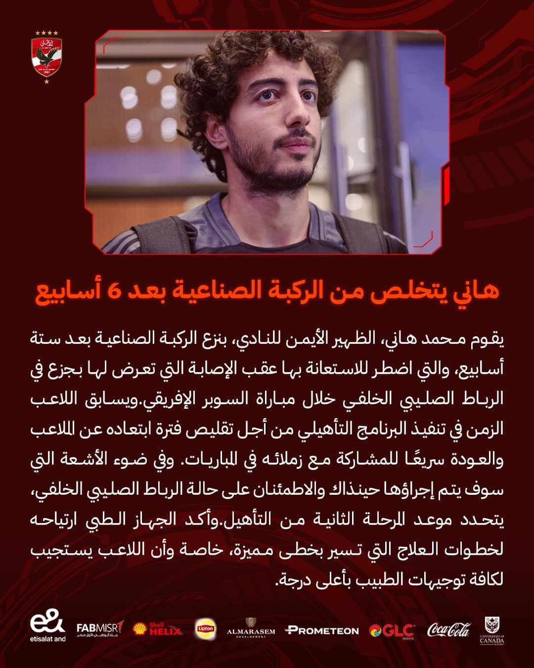 يقوم محمد هاني، الظهير الأيمن للنادي، بنزع الركبة الصناعية بعد ستة أسابيع، والتي اضطر للاستعانة بها عقب الإصابة التي تعرض لها بجزع في الرباط الصليبي الخلفي خلال مباراة السوبر الإفريقي.