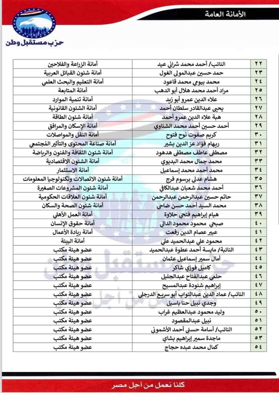 كما تم اختيار النائبة صبورة السيد أمينة للمرأة، والنائب عبد الوهاب خليل أمينا لتنظيم، وعمرو نبيل فهمي أمينا للعضوية، أحمد الوليد أمينا للشباب، وهند رشاد أمينا للإعلام، والنائب محمد سلطان، أمينا للعلاقات العامة.