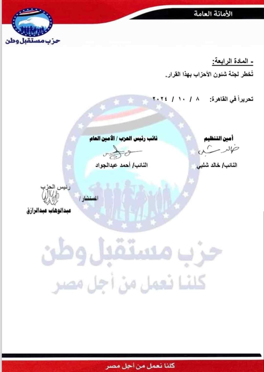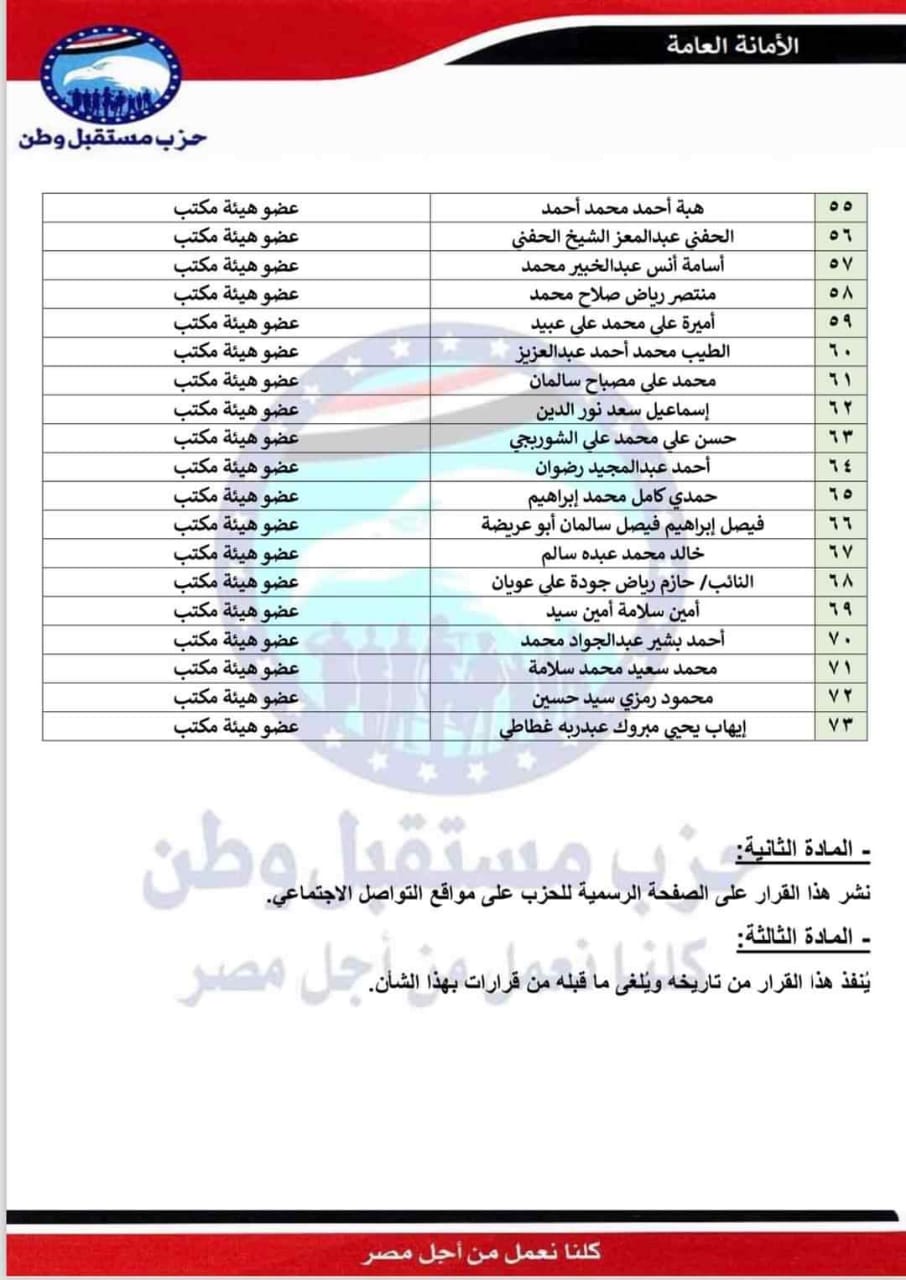 مستقبل وطن بالجيزة.. سعفان أمينا للمحافظة وخليل للتنظيم وصبورة للمرأة وسلطان للعلاقات العامة