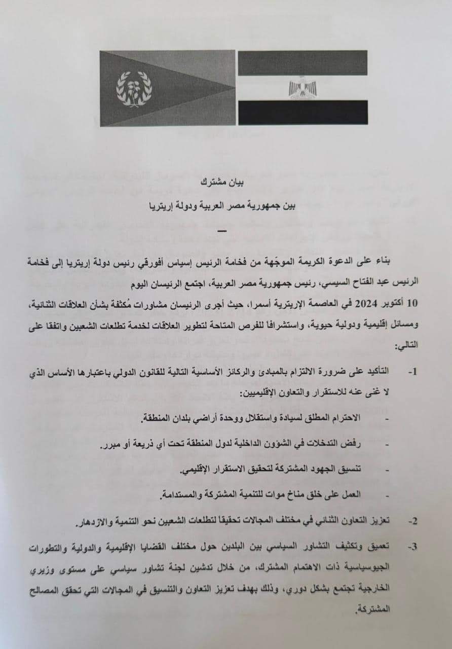 بيان مشترك بين جمهورية مصر العربية ودولة إريتريا