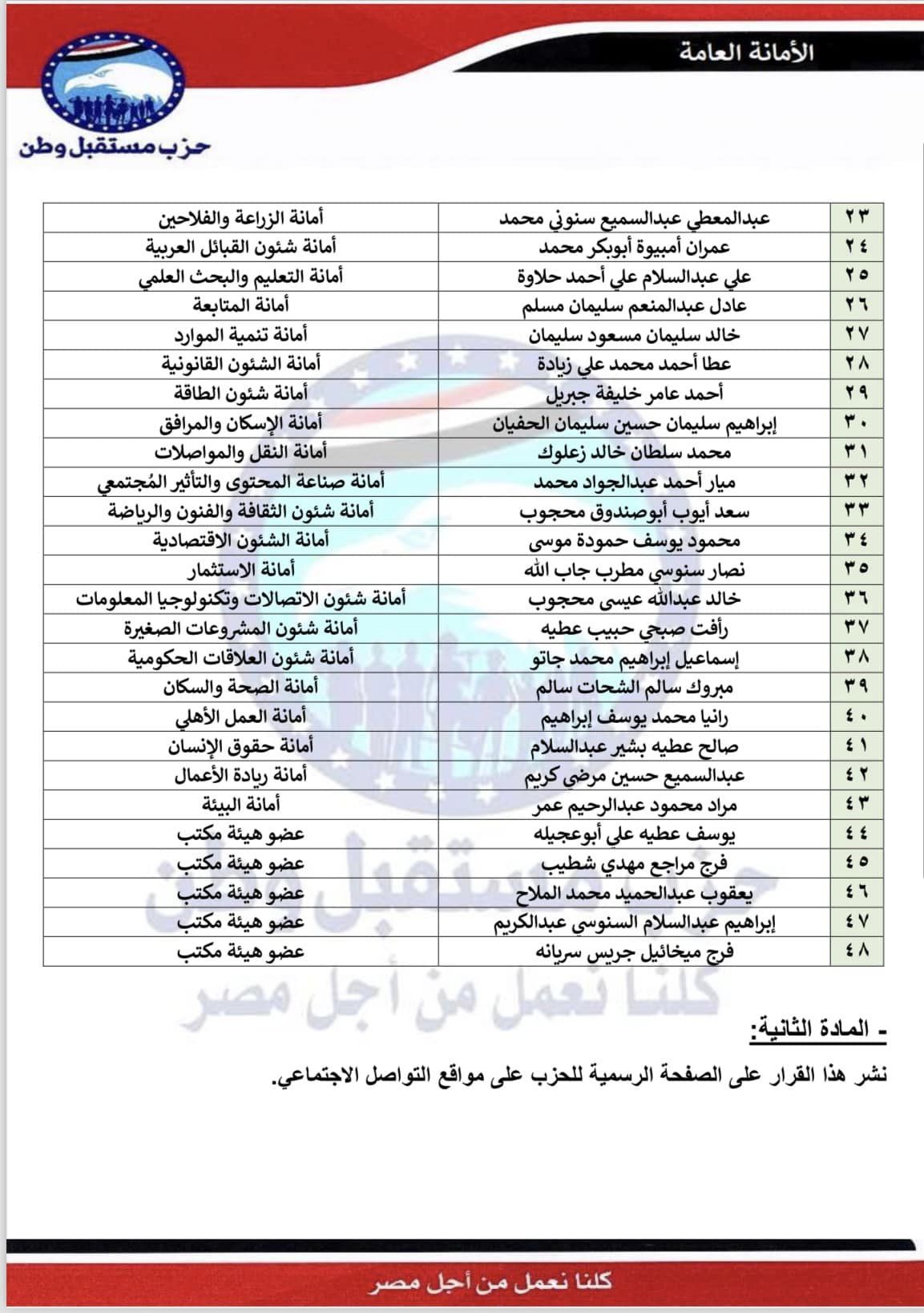 وكان أصدر حزب مستقبل وطن برئاسة المستشار عبد الوهاب عبد الرازق، قرارات تنظيمية جديدة في ضوء حركة التغييرات الأخيرة وذلك بإعادة تشكيل أمانة محافظة قنا