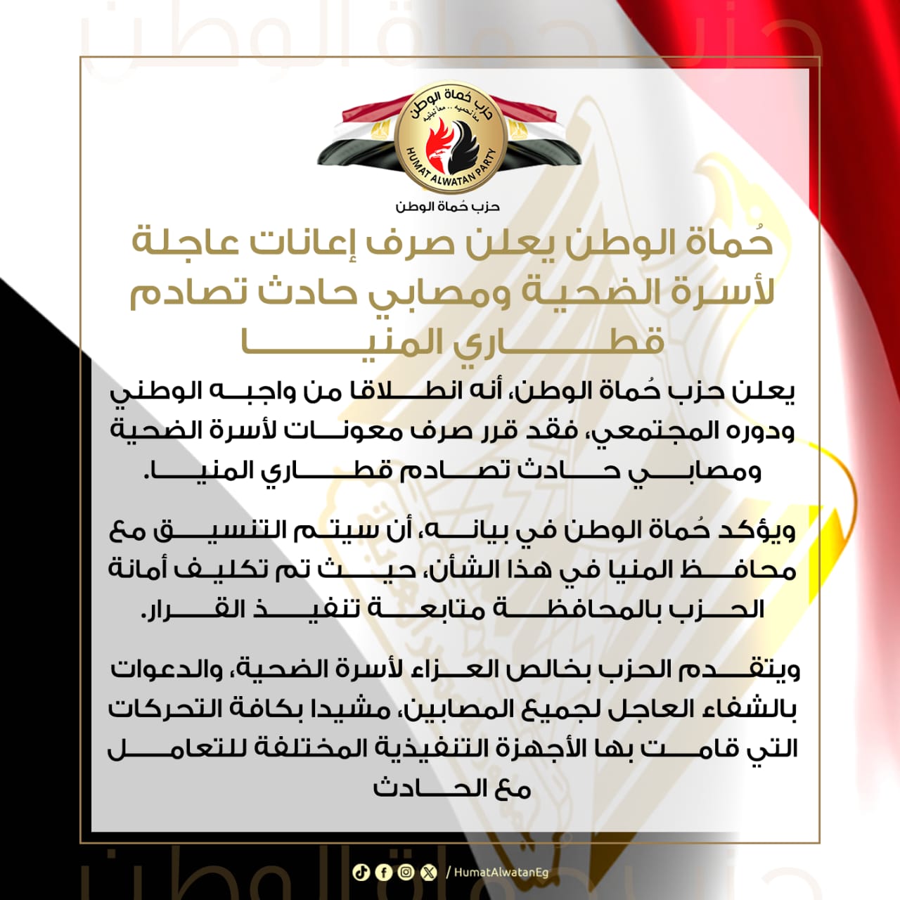 أعلن حزب حماة الوطن، أنه انطلاقا من واجبه الوطني ودوره المجتمعي، فقد قرر صرف معونات لأسرة الضحية ومصابي حادث تصادم قطاري المنيا.