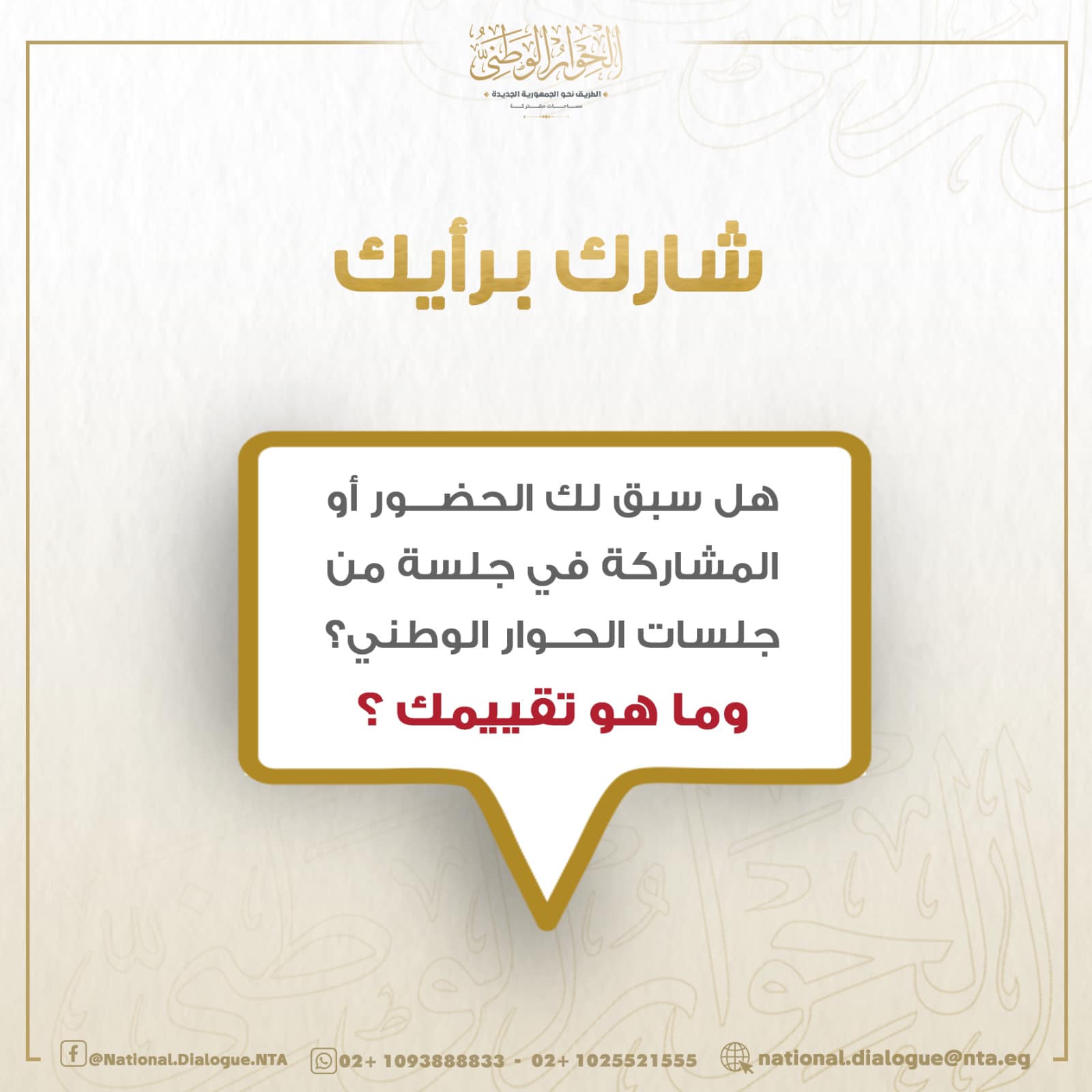 وأعربت الأمانة الفنية للحوار الوطني عن حرصها الشديد والبالغ على التطوير السمتمر والبناء لجلسات الحوار الوطني، كما يسعدها استقبال تقييمكم وملاحظاتكم على سير وتنظيم الجلسات، إذا سبق لحضراتكم الحضور أو المشاركة في إحدى جلسات الحوار الوطني السابقة من خلال استمارة التقييم التالية: