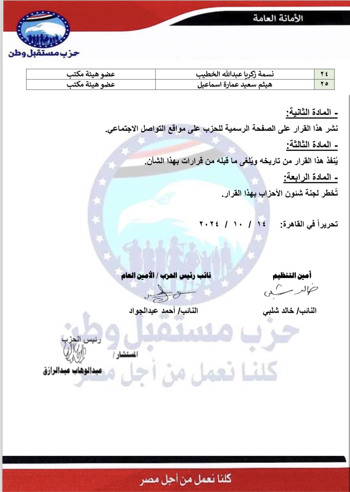 التشكيل الجديد لأمانة الشئون التشريعية بحزب مستقبل وطن