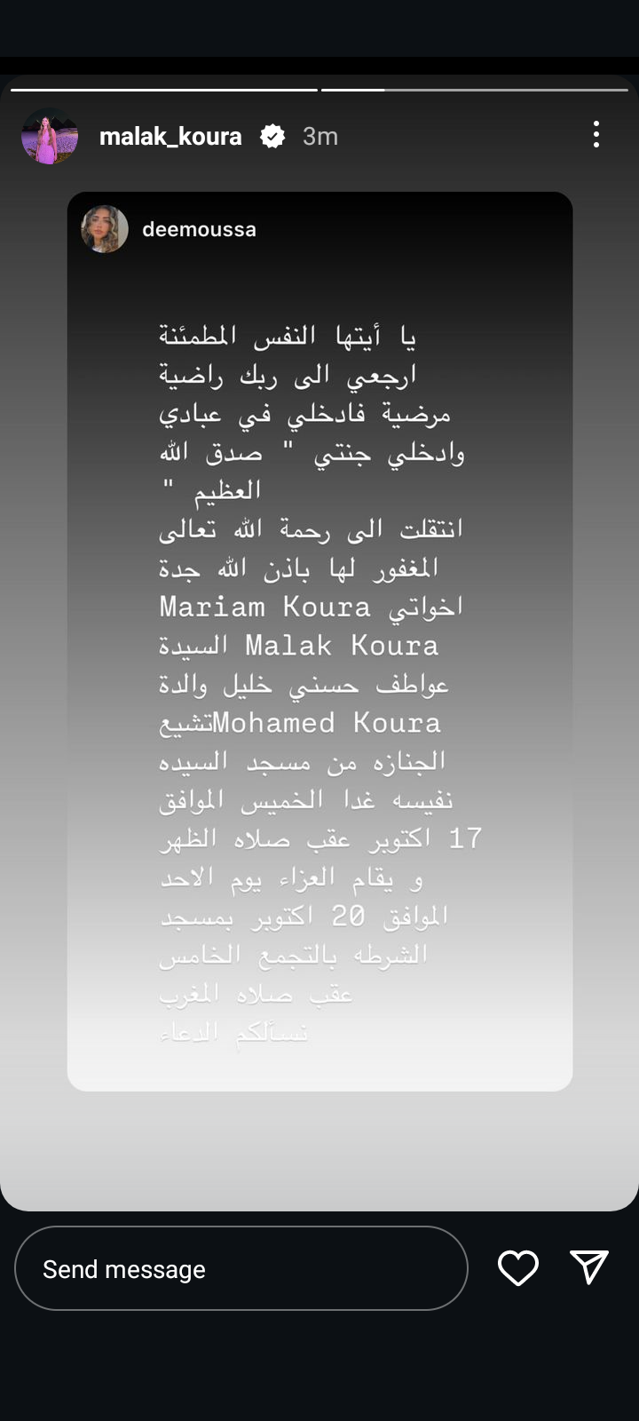 وكشفت ملك قورة عن موعد ومكان جنازة جدتها، حيث قالت في منشور عبر حسابها الرسمي بموقع تبادل الصور والفيديوهات انستجرام، ورصده موقع تحيا مصر: تشييع الجنازة من مسجد السيدة نفسية غدا الخميس الموافق 17 من شهر أكتوبر الجاري عقب صلاة الظهر.