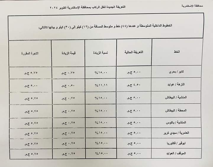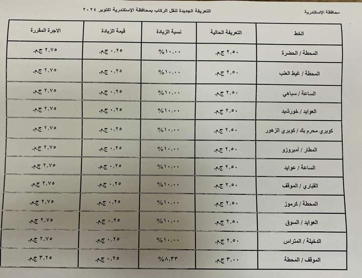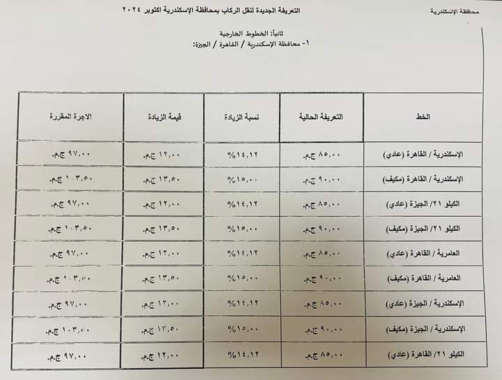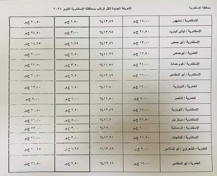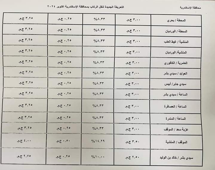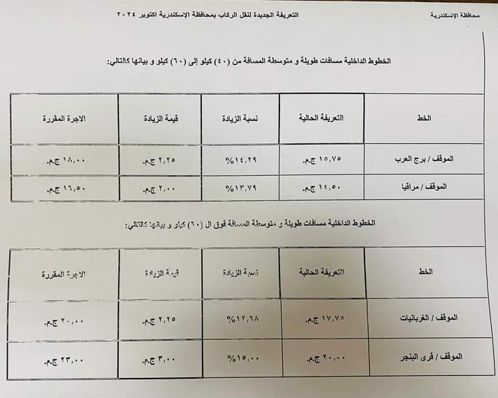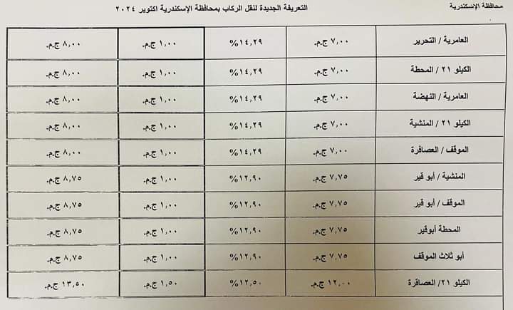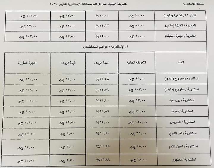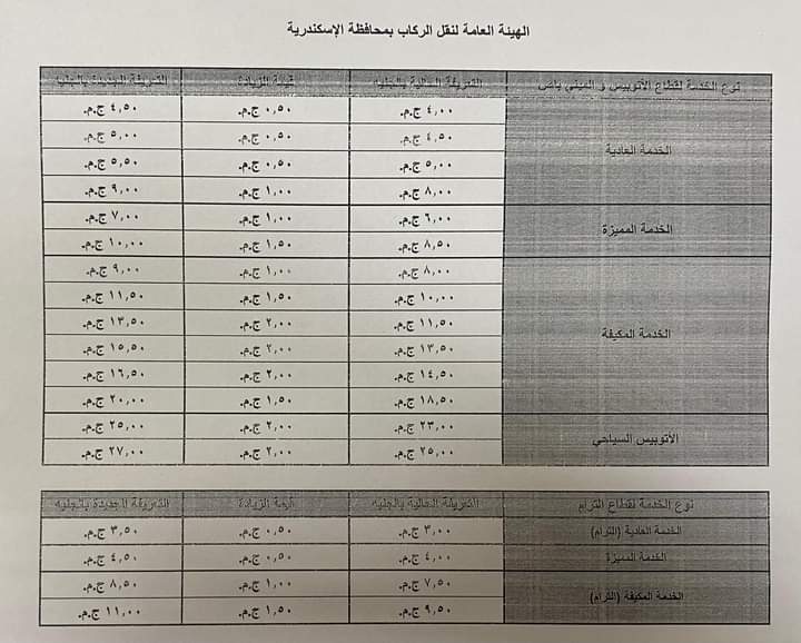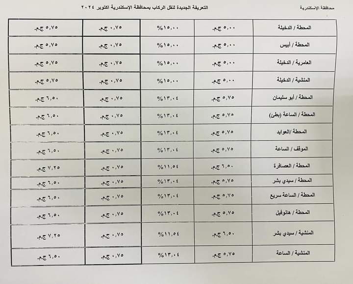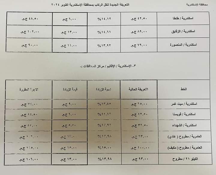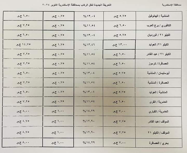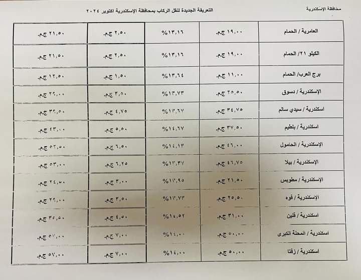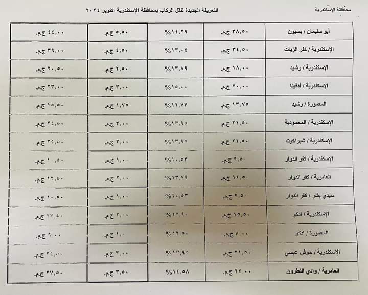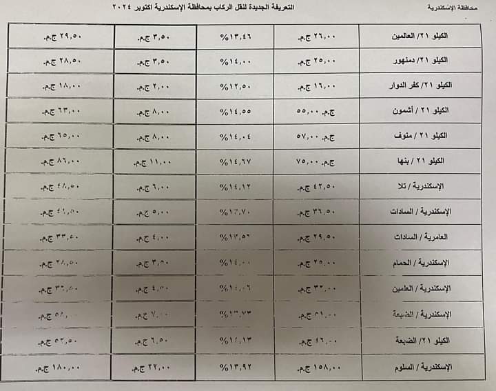 اعتمدت محافظة الإسكندرية، تعريفة الركوب الجديدة لسيارات الأجرة لوسائل النقل الداخلية والخارجية والنقل العام بالمحافظة والمقدمة من مشروع محطات الركاب والانتظار ويتم تطبيقها بدءًا من تاريخ الاعتماد طبقًا للجداول المرفقة، وذلك في ضوء قرار لجنة التسعير التلقائي لأسعار المنتجات البترولية بوزارة البترول.