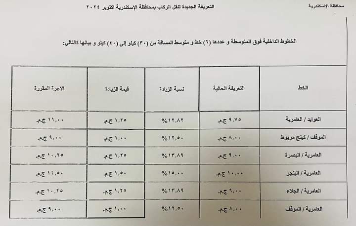 وأوضح الفريق أحمد خالد حسن سعيد محافظ الإسكندرية، أن اللجنة التي تم تشكيلها لتعديل التعريفات وضعت في اعتبارها مسافة كل خط سير وعدد الرحلات تحقيقًا للعدالة، مشيرًا إلى أنه بالنسبة لأوتوبيسات وسيارات ووسائل النقل العام فإن الزيادة المقررة نسبتها متباينة تصل إلى 15%، على أن يتم إعلان التعريفات الجديدة وتعليقها بكافة المواقف وبصورة واضحة.