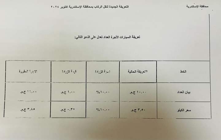 محافظة الإسكندرية تعتمد التعريفة الجديدة لسيارات الأجرة لوسائل النقل الداخلية والخارجية والنقل العام