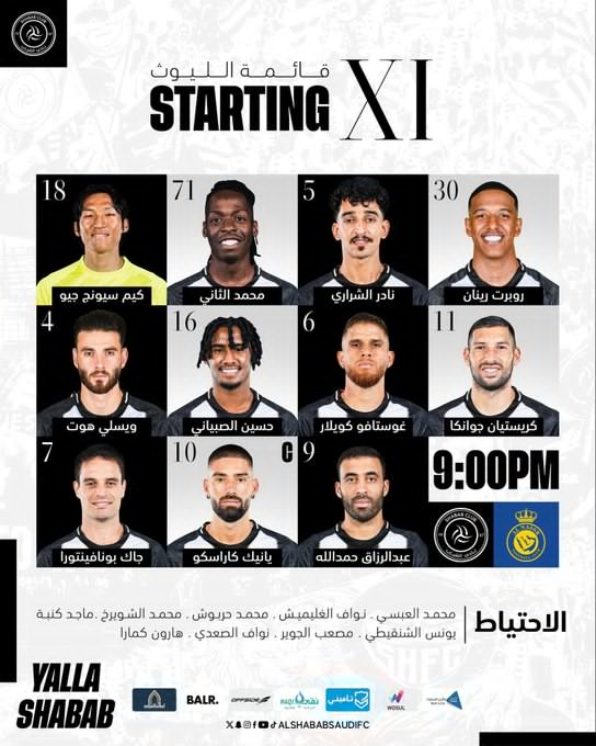 التشكيل الرسمي لنادي النصر أمام الشباب في دور روشن السعودي