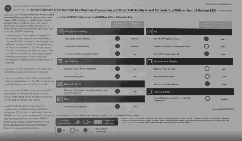 تضمنت الوثائق المسربة معلومات استخباراتية حساسة حول عمليات نقل أسلحة متقدمة جرت في الأيام الأخيرة داخل قواعد سلاح الجو الإسرائيلي، تحضيرًا لرد عسكري إسرائيلي على هجوم صاروخي باليستي إيراني وقع في الأول من أكتوبر. وكشفت الوثائق أن إسرائيل تنسق هذه الضربة بمساعدة ما يُعرف بـ"عيونها الخمس"، وهو تحالف استخباراتي يشمل الولايات المتحدة، بريطانيا، كندا، أستراليا، ونيوزيلندا.