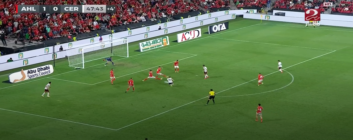 وكان سيراميكا الأفضل طوال أحداث الشوط الأول من عمر المباراة، ونجح أن يسجل التعادل بعد خطأ دفاعي فادح من رامي ربيعة في تشتيت الكرة وتصل إلى أحمد بلحاج ويمرر الكرة إلى فاخري لاكاي الغير مراقب.