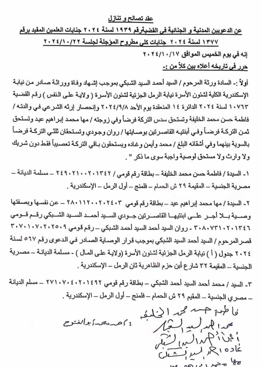 حصل موقع تحيا مصر على نسخة من عقد الصلح والتنازل من أسرة السيد الشبكي، ضحية دهس لاعب الزمالك أحمد فتوح، بعد توقيع عقد التصالح خلال الجلسة الثالث اليوم الثلاثاء.