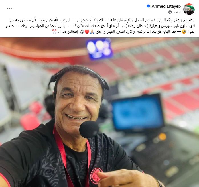 وكتب "الطيب" عبر صفحته الشخصية على فيس بوك: "رغم إنى زعلان منّه !! لكن لابد من السؤال و الإطمئنان عليه — أقصد / أحمد شوبير — ان شاء الله يكون بخير. لأن منذ خروجه من قنوات اون تايم سبورتس.و عبارة (سلطان زمانه ) لم. أراه او أسمع عنه فى اى مكان".