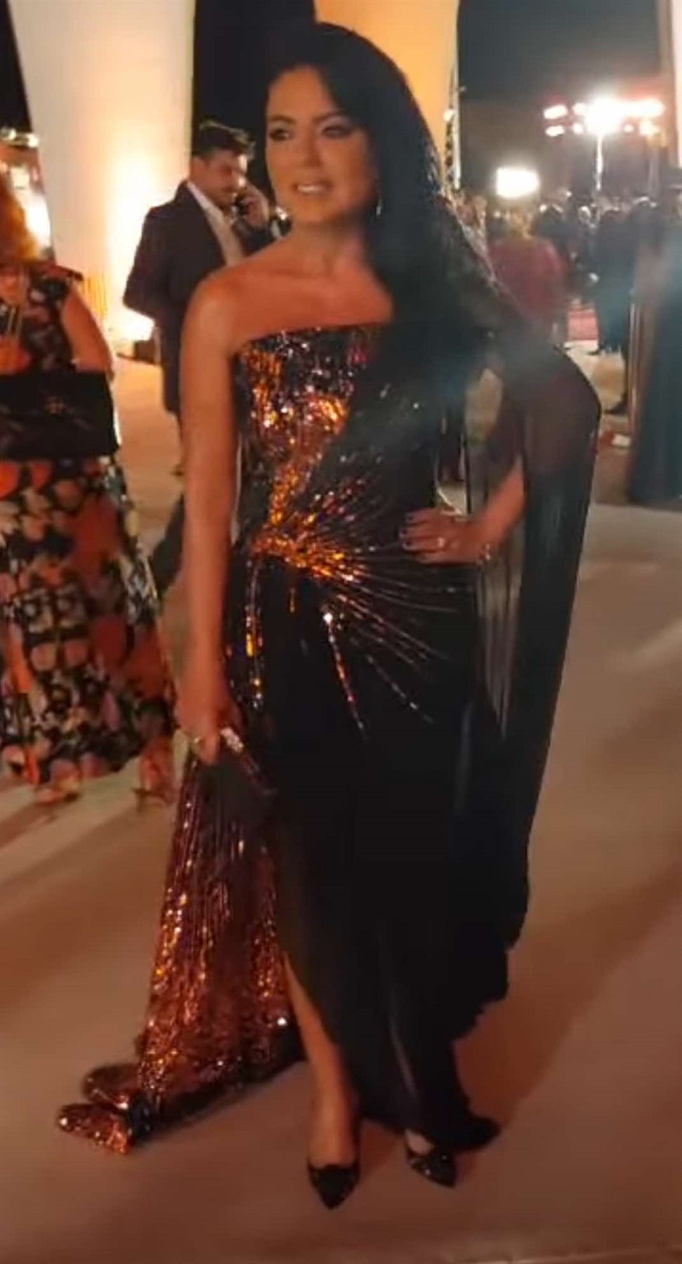 واعتمدت رانيا يوسف على إطلالة مثيرة للجدل، مرتدية فستان باللون الأسود لامع باللون الأحمر، بالقماش المطرز والشيفون وانتعلت حذاء بكعب عالي باللون الاسود اللامع أيضا لاستكمال أناقتها حسب ما رصد موقع تحيا مصر.