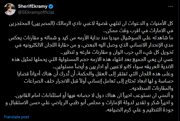 وتابع شريف إكرامي، عسى أن يعي الجميع بعد انتهاء هذه الأزمه حجم المسئولية التي يحملها تمثيل هذه الأندية العريقه سواء كانو لاعبين أو إداريين وأيضاً مسئولين، وعلى هذه اللجان التي تفتقر إلى العقل والحكمة، أن تُدرك أن هناك أحياناً قضايا حساسة و لها أبعاد تحتاج إلى تعامل إنساني أولاً قبل الإنجرار خلف الصراعات المقارنات السطحية.