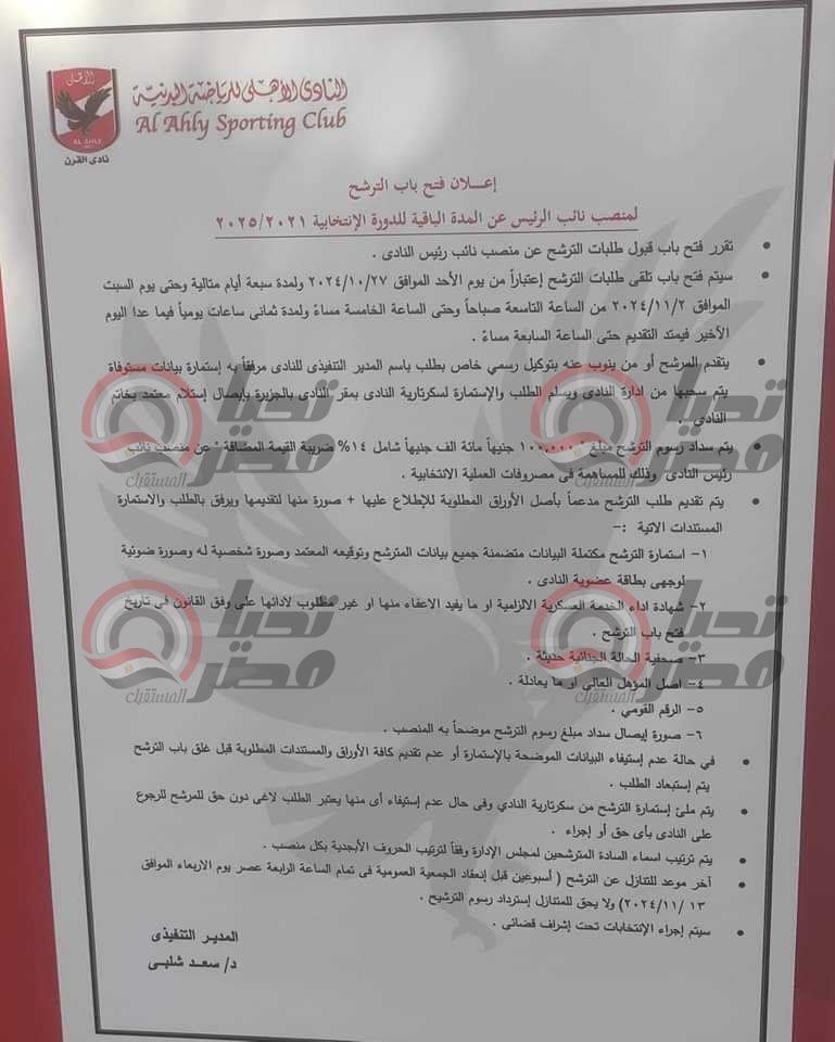 الأهلي يعلن رسميًا فتح باب الترشح لمنصب نائب رئيس النادي غدًا (مستند)