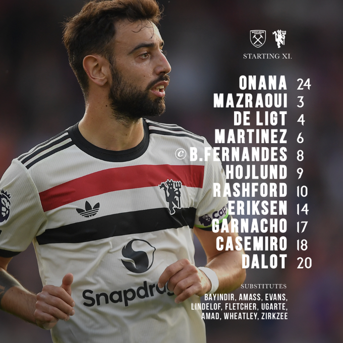 يدل الهولندي إيريك تين هاج المدير الفني لنادي مانشستر يونايتد، المباراة أمام وست هام يونايتد، ضمن مباريات الجولة التاسعة من الدوري لإنجليزي الممتاز، بالتشكيل التالي: