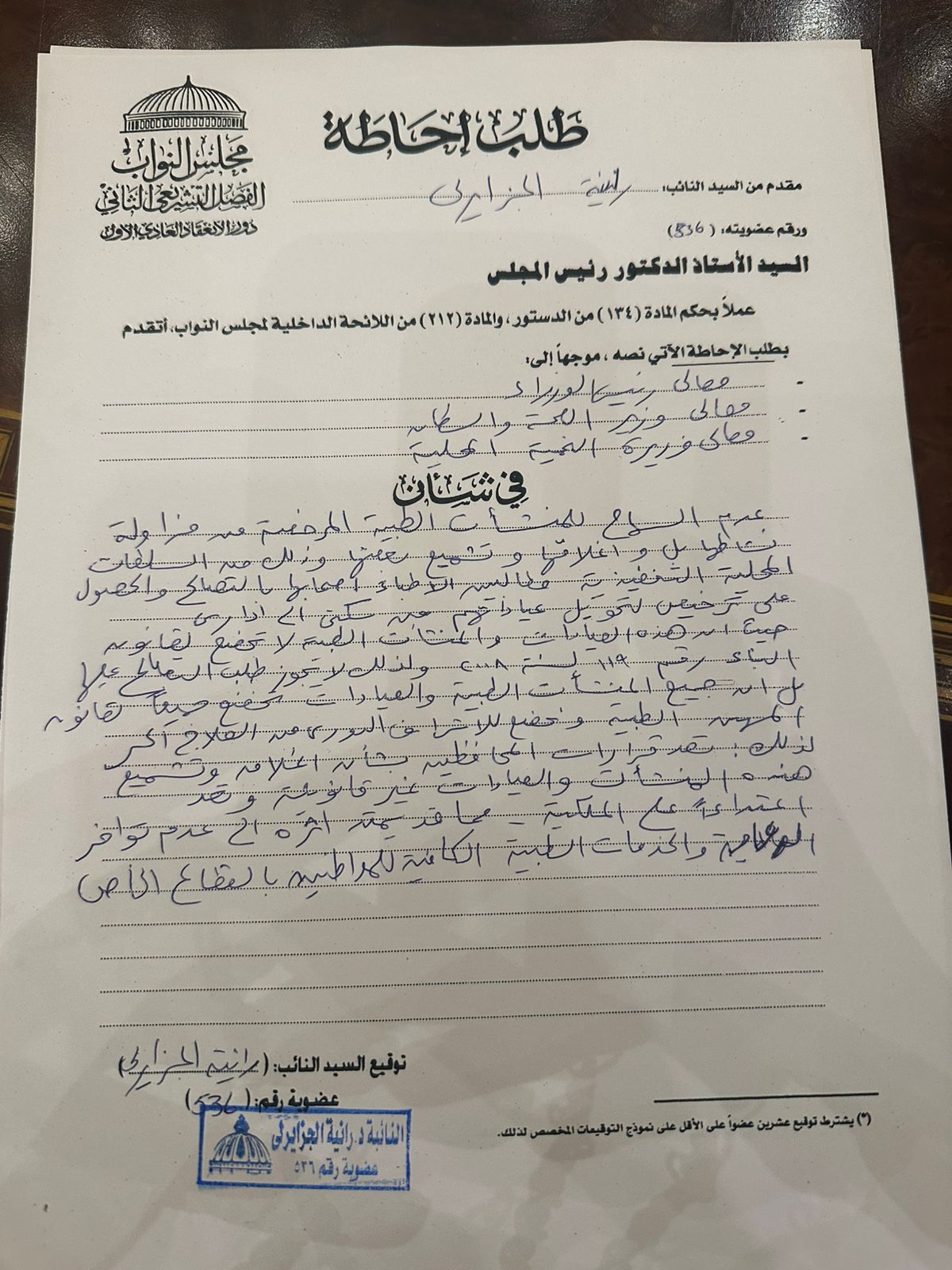 طلب إحاطة المرخصة بشأن اغلاق المنشأت الطبية والعيادات وتشميعها لاجراء التصالح علي السكني والاداري