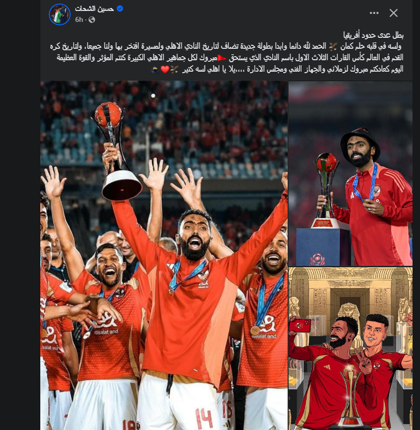 تحيا مصر، وكتب حسين الشحات لاعب الأهلي عبر حسابه الرسمي" فيس بوك":" بطل عدى حدود أفريقيا؟، ولسه في قلبه حلم كمان ، الحمد لله دائما وابدا بطولة جديدة تضاف لتاريخ النادي الاهلي ولمسيرة افتخر بها ولنا جميعا، ولتاريخ كره القدم في العالم كأس القارات الثلاث الاول باسم النادي الذي يستحق".