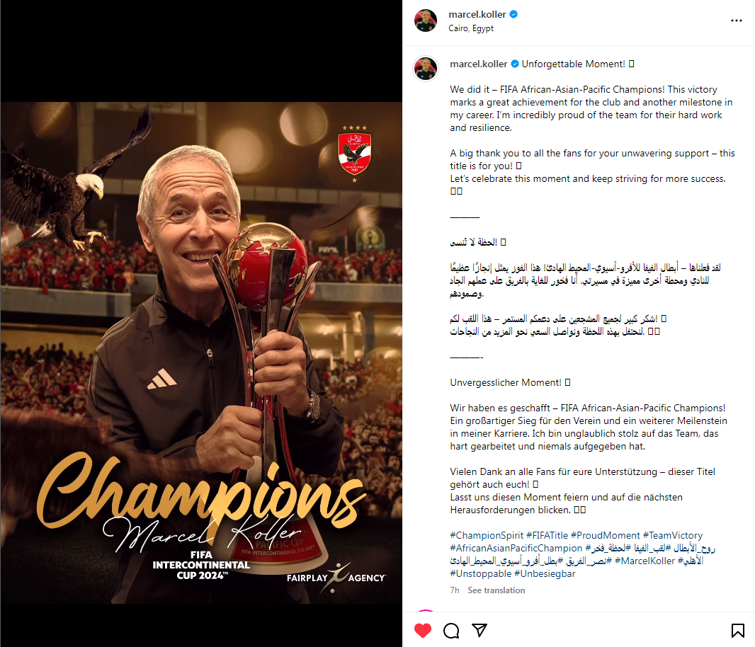 وكتب مارسيل كولر عبر حسابه الرسمي"إنستجرام": لحظة لا تُنسى لقد فعلناها أبطال الفيفا للأفرو-آسيوي-المحيط الهادئ!هذا الفوز يمثل إنجازًا عظيمًا للنادي ومحطة أخرى مميزة في مسيرتي أنا فخور للغاية بالفريق على عملهم الجاد وصمودهم".