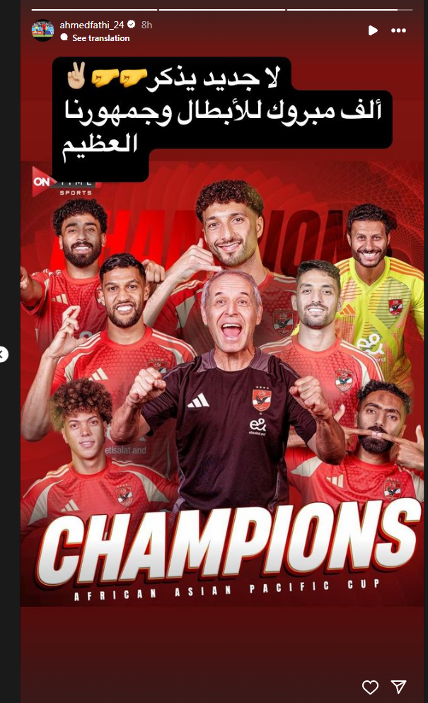 أحمد فتحي يحتفل بفوز الأهلي أمام العين: لاجديد يذكر الف مبروك للأبطال وجمهورنا العظيم