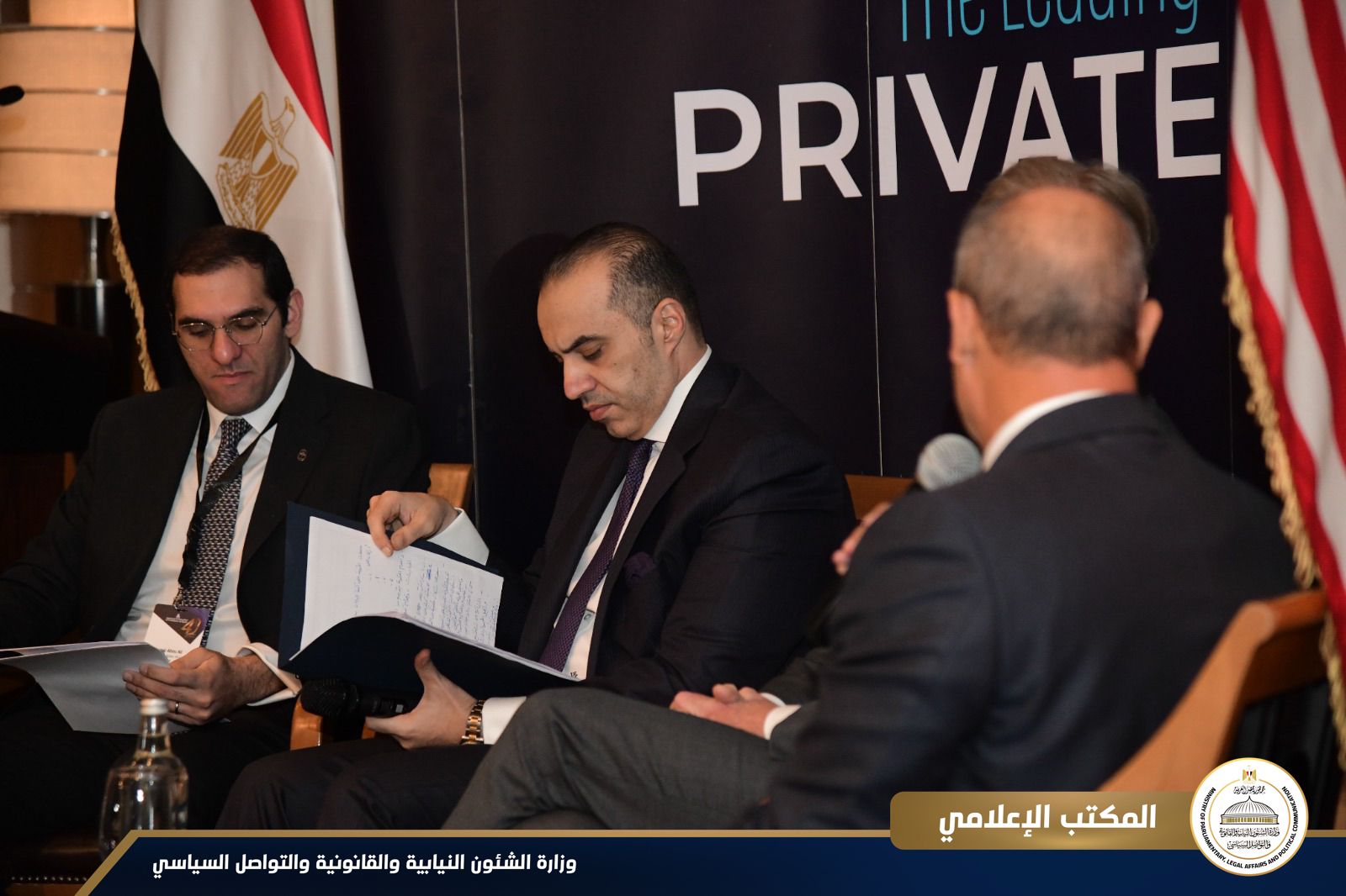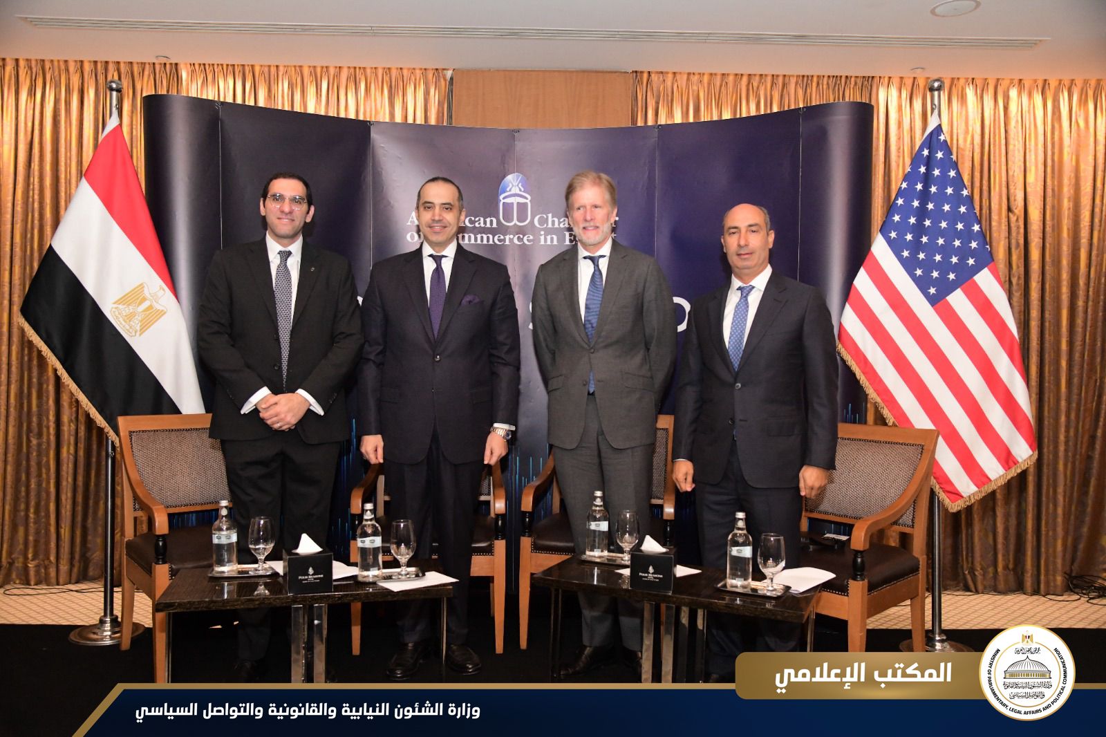 في ضوء مهام وزارة الشئون النيابية والقانونية والتواصل السياسي، وتبع ذلك حلقة نقاشية مع جيف بولوينكل، نائب الرئيس شركة مايكروسفت العالمية للشؤون المؤسسية والخارجية والقانونية، وأدار الجلسة النقاشية جمال أبو علي، نائب رئيس غرفة التجارة الأمريكية للشئون القانونية، و حسام سيف الدين، الرئيس المشارك للجنة التحول الرقمي في غرفة التجارة الأمريكية والرئيس التنفيذي لشركة كابجيميني.